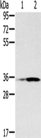 Gel: 8%SDS-PAGE, Lysate: 40 μg, Lane 1-2: Human placenta tissue, Human fetal liver tissue, Primary antibody: CSB-PA817186(NIT1 Antibody) at dilution 1/400, Secondary antibody: Goat anti rabbit IgG at 1/8000 dilution, Exposure time: 5 minutes