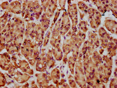 IHC image of CSB-PA863161LA01HU diluted at 1:300 and staining in paraffin-embedded human pancreatic cancer performed on a Leica BondTM system. After dewaxing and hydration, antigen retrieval was mediated by high pressure in a citrate buffer (pH 6.0). Section was blocked with 10% normal goat serum 30min at RT. Then primary antibody (1% BSA) was incubated at 4°C overnight. The primary is detected by a biotinylated secondary antibody and visualized using an HRP conjugated SP system.