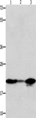 Gel: 10+12%SDS-PAGE, Lysate: 40 μg, Lane 1-3: 231 cells, A549 cells, human liver cancer tissue, Primary antibody: CSB-PA079049(NME1 Antibody) at dilution 1/600, Secondary antibody: Goat anti rabbit IgG at 1/8000 dilution, Exposure time: 10 seconds