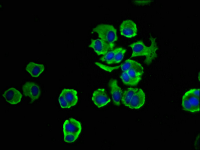 Immunofluorescence staining of MCF-7 cells with CSB-PA015931LA01HU at 1:33, counter-stained with DAPI. The cells were fixed in 4% formaldehyde, permeabilized using 0.2% Triton X-100 and blocked in 10% normal Goat Serum. The cells were then incubated with the antibody overnight at 4°C. The secondary antibody was Alexa Fluor 488-congugated AffiniPure Goat Anti-Rabbit IgG(H+L).