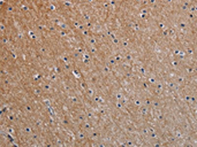 The image on the left is immunohistochemistry of paraffin-embedded Human brain tissue using CSB-PA120772(NOX1 Antibody) at dilution 1/40, on the right is treated with synthetic peptide. (Original magnification: ×200)