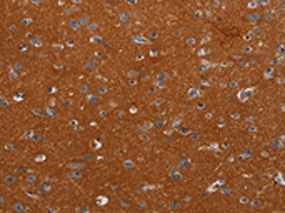 The image on the left is immunohistochemistry of paraffin-embedded Human brain tissue using CSB-PA655952(NOX3 Antibody) at dilution 1/40, on the right is treated with synthetic peptide. (Original magnification: ×200)