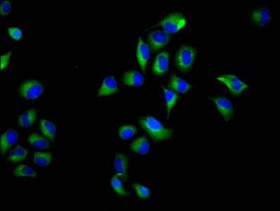 Immunofluorescence staining of Hela cells with CSB-PA015964LA01HU at 1:66, counter-stained with DAPI. The cells were fixed in 4% formaldehyde, permeabilized using 0.2% Triton X-100 and blocked in 10% normal Goat Serum. The cells were then incubated with the antibody overnight at 4°C. The secondary antibody was Alexa Fluor 488-congugated AffiniPure Goat Anti-Rabbit IgG(H+L).