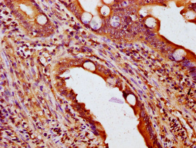 IHC image of CSB-PA015964LA01HU diluted at 1:200 and staining in paraffin-embedded human small intestine tissue performed on a Leica BondTM system. After dewaxing and hydration, antigen retrieval was mediated by high pressure in a citrate buffer (pH 6.0). Section was blocked with 10% normal goat serum 30min at RT. Then primary antibody (1% BSA) was incubated at 4°C overnight. The primary is detected by a biotinylated secondary antibody and visualized using an HRP conjugated SP system.