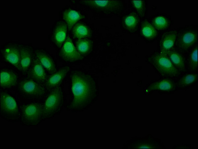 Immunofluorescence staining of A549 cells with CSB-PA015987LA01HU at 1:166, counter-stained with DAPI. The cells were fixed in 4% formaldehyde, permeabilized using 0.2% Triton X-100 and blocked in 10% normal Goat Serum. The cells were then incubated with the antibody overnight at 4°C. The secondary antibody was Alexa Fluor 488-congugated AffiniPure Goat Anti-Rabbit IgG(H+L).