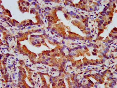 IHC image of CSB-PA015987LA01HU diluted at 1:500 and staining in paraffin-embedded human lung cancer performed on a Leica BondTM system. After dewaxing and hydration, antigen retrieval was mediated by high pressure in a citrate buffer (pH 6.0). Section was blocked with 10% normal goat serum 30min at RT. Then primary antibody (1% BSA) was incubated at 4°C overnight. The primary is detected by a biotinylated secondary antibody and visualized using an HRP conjugated SP system.