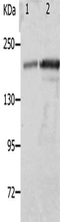 Gel: 8%SDS-PAGE, Lysate: 40 μg, Lane 1-2: Mouse spleen tissue, Mouse kidney tissue, Primary antibody: CSB-PA909441(NPHS1 Antibody) at dilution 1/800, Secondary antibody: Goat anti rabbit IgG at 1/8000 dilution, Exposure time: 1 minute