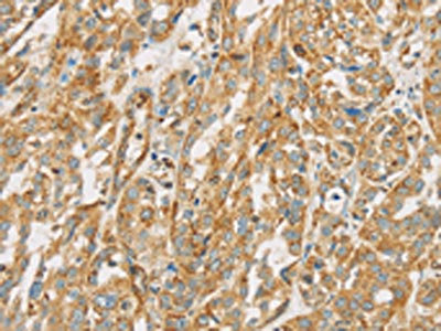 The image on the left is immunohistochemistry of paraffin-embedded Human breast cancer tissue using CSB-PA032496(NPPB Antibody) at dilution 1/30, on the right is treated with fusion protein. (Original magnification: ×200)