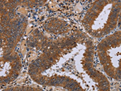 The image on the left is immunohistochemistry of paraffin-embedded Human colon cancer tissue using CSB-PA169583(NPTX1 Antibody) at dilution 1/50, on the right is treated with synthetic peptide. (Original magnification: ×200)