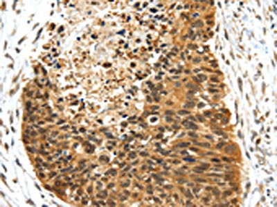 The image on the left is immunohistochemistry of paraffin-embedded Human esophagus cancer tissue using CSB-PA995384(NR2F2 Antibody) at dilution 1/25, on the right is treated with synthetic peptide. (Original magnification: ×200)