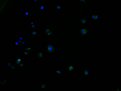 Immunofluorescence staining of HepG2 cells with CSB-PA848829LA01HU at 1:100, counter-stained with DAPI. The cells were fixed in 4% formaldehyde and blocked in 10% normal Goat Serum. The cells were then incubated with the antibody overnight at 4°C. The secondary antibody was Alexa Fluor 488-congugated AffiniPure Goat Anti-Rabbit IgG(H+L).