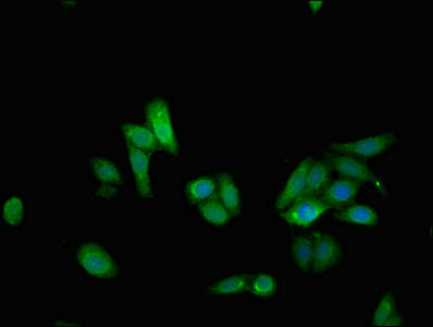 Immunofluorescent analysis of HepG2 cells using CSB-PA885733LA01HU at dilution of 1:100 and Alexa Fluor 488-congugated AffiniPure Goat Anti-Rabbit IgG(H+L)