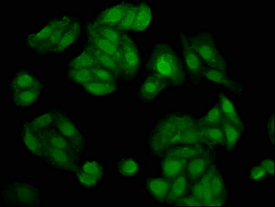 Immunofluorescence staining of HepG2 cells with CSB-PA891535LA01HU at 1:200, counter-stained with DAPI. The cells were fixed in 4% formaldehyde, permeabilized using 0.2% Triton X-100 and blocked in 10% normal Goat Serum. The cells were then incubated with the antibody overnight at 4°C. The secondary antibody was Alexa Fluor 488-congugated AffiniPure Goat Anti-Rabbit IgG(H+L).