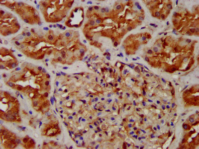 IHC image of CSB-PA897595LA01HU diluted at 1:300 and staining in paraffin-embedded human kidney tissue performed on a Leica BondTM system. After dewaxing and hydration, antigen retrieval was mediated by high pressure in a citrate buffer (pH 6.0). Section was blocked with 10% normal goat serum 30min at RT. Then primary antibody (1% BSA) was incubated at 4°C overnight. The primary is detected by a biotinylated secondary antibody and visualized using an HRP conjugated SP system.