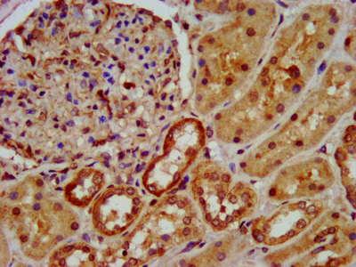 IHC image of CSB-PA851524LA01HU diluted at 1:600 and staining in paraffin-embedded human kidney tissue performed on a Leica BondTM system. After dewaxing and hydration, antigen retrieval was mediated by high pressure in a citrate buffer (pH 6.0). Section was blocked with 10% normal goat serum 30min at RT. Then primary antibody (1% BSA) was incubated at 4°C overnight. The primary is detected by a biotinylated secondary antibody and visualized using an HRP conjugated SP system.