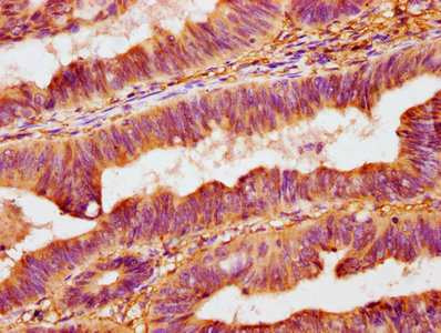 IHC image of CSB-PA016333LA01HU diluted at 1:400 and staining in paraffin-embedded human colon cancer performed on a Leica BondTM system. After dewaxing and hydration, antigen retrieval was mediated by high pressure in a citrate buffer (pH 6.0). Section was blocked with 10% normal goat serum 30min at RT. Then primary antibody (1% BSA) was incubated at 4°C overnight. The primary is detected by a biotinylated secondary antibody and visualized using an HRP conjugated SP system.