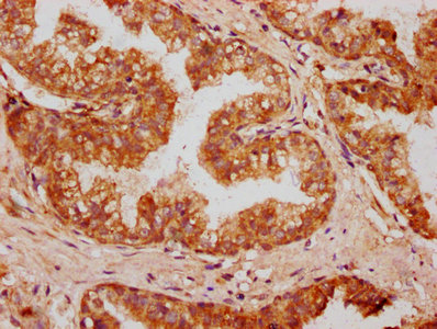 IHC image of CSB-PA016333LA01HU diluted at 1:400 and staining in paraffin-embedded human prostate cancer performed on a Leica BondTM system. After dewaxing and hydration, antigen retrieval was mediated by high pressure in a citrate buffer (pH 6.0). Section was blocked with 10% normal goat serum 30min at RT. Then primary antibody (1% BSA) was incubated at 4°C overnight. The primary is detected by a biotinylated secondary antibody and visualized using an HRP conjugated SP system.