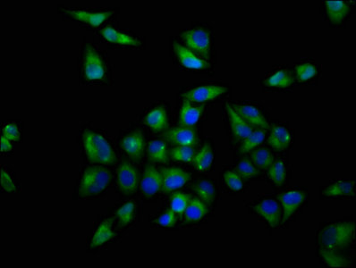 Immunofluorescence staining of Hela cells with CSB-PA016360LA01HU at 1:200, counter-stained with DAPI. The cells were fixed in 4% formaldehyde, permeabilized using 0.2% Triton X-100 and blocked in 10% normal Goat Serum. The cells were then incubated with the antibody overnight at 4°C. The secondary antibody was Alexa Fluor 488-congugated AffiniPure Goat Anti-Rabbit IgG(H+L).