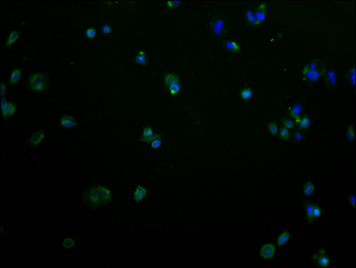 Immunofluorescence staining of MCF-7 cells with CSB-PA850420OA01HU at 1:100, counter-stained with DAPI. The cells were fixed in 4% formaldehyde and blocked in 10% normal Goat Serum. The cells were then incubated with the antibody overnight at 4°C. The secondary antibody was Alexa Fluor 488-congugated AffiniPure Goat Anti-Rabbit IgG(H+L).