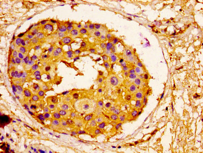 IHC image of CSB-PA05709A0Rb diluted at 1:100 and staining in paraffin-embedded human breast cancer performed on a Leica BondTM system. After dewaxing and hydration, antigen retrieval was mediated by high pressure in a citrate buffer (pH 6.0). Section was blocked with 10% normal goat serum 30min at RT. Then primary antibody (1% BSA) was incubated at 4°C overnight. The primary is detected by a biotinylated secondary antibody and visualized using an HRP conjugated SP system.
