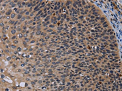 The image on the left is immunohistochemistry of paraffin-embedded Human cervical cancer tissue using CSB-PA211403(P2RX2 Antibody) at dilution 1/50, on the right is treated with synthetic peptide. (Original magnification: ×200)