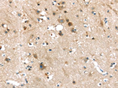 The image on the left is immunohistochemistry of paraffin-embedded Human brain tissue using CSB-PA576176(P2RY2 Antibody) at dilution 1/30, on the right is treated with synthetic peptide. (Original magnification: ×200)