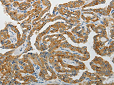 The image on the left is immunohistochemistry of paraffin-embedded Human thyroid cancer tissue using CSB-PA266740(PADI4 Antibody) at dilution 1/25, on the right is treated with fusion protein. (Original magnification: ×200)