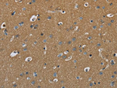 The image on the left is immunohistochemistry of paraffin-embedded Human brain tissue using CSB-PA198597(PAEP Antibody) at dilution 1/60, on the right is treated with fusion protein. (Original magnification: ×200)
