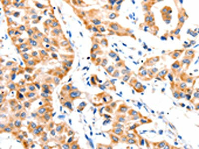 The image on the left is immunohistochemistry of paraffin-embedded Human liver cancer tissue using CSB-PA081195(PAFAH1B1 Antibody) at dilution 1/25, on the right is treated with synthetic peptide. (Original magnification: ×200)