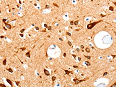 The image on the left is immunohistochemistry of paraffin-embedded Human brain tissue using CSB-PA614772(PAFAH1B1 Antibody) at dilution 1/20, on the right is treated with synthetic peptide. (Original magnification: ×200)