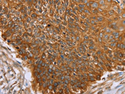 The image on the left is immunohistochemistry of paraffin-embedded Human cervical cancer tissue using CSB-PA921138(PAICS Antibody) at dilution 1/50, on the right is treated with fusion protein. (Original magnification: ×200)