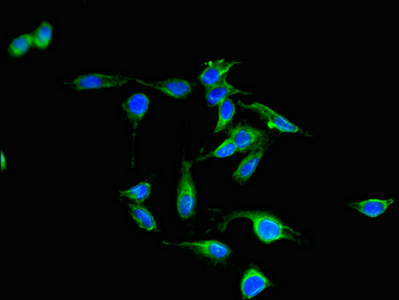 Immunofluorescent analysis of Hela cells using CSB-PA017407LA01HU at dilution of 1:100 and Alexa Fluor 488-congugated AffiniPure Goat Anti-Rabbit IgG(H+L)