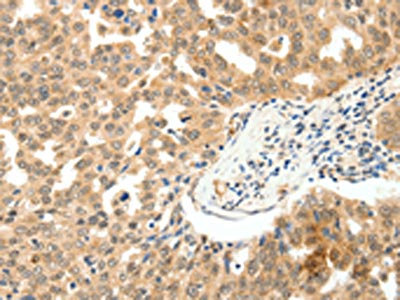The image on the left is immunohistochemistry of paraffin-embedded Human ovarian cancer tissue using CSB-PA158224(PAK7 Antibody) at dilution 1/10, on the right is treated with fusion protein. (Original magnification: ×200)