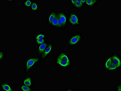 Immunofluorescent analysis of HepG2 cells using CSB-PA874850LA01HU at dilution of 1:100 and Alexa Fluor 488-congugated AffiniPure Goat Anti-Rabbit IgG(H+L)