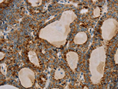 The image on the left is immunohistochemistry of paraffin-embedded Human thyroid cancer tissue using CSB-PA193064(PARL Antibody) at dilution 1/20, on the right is treated with fusion protein. (Original magnification: ×200)