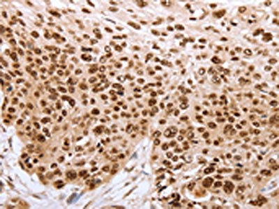 The image on the left is immunohistochemistry of paraffin-embedded Human esophagus cancer tissue using CSB-PA436053(PARP1 Antibody) at dilution 1/40, on the right is treated with synthetic peptide. (Original magnification: ×200)