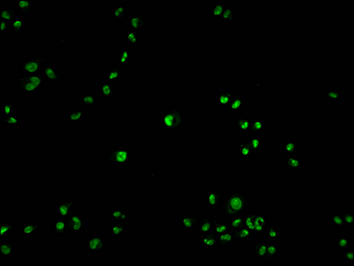 Immunofluorescence staining of Hela cells with CSB-PA017457LA01HU at 1:100, counter-stained with DAPI. The cells were fixed in 4% formaldehyde and blocked in 10% normal Goat Serum. The cells were then incubated with the antibody overnight at 4°C. The secondary antibody was Alexa Fluor 488-congugated AffiniPure Goat Anti-Rabbit IgG(H+L).