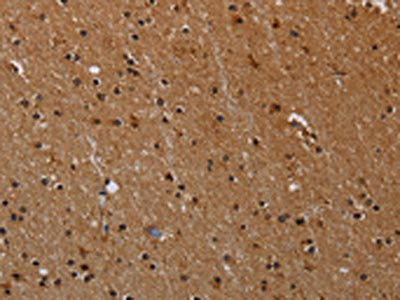 The image on the left is immunohistochemistry of paraffin-embedded Human brain tissue using CSB-PA035787(PARP8 Antibody) at dilution 1/40, on the right is treated with synthetic peptide. (Original magnification: ×200)