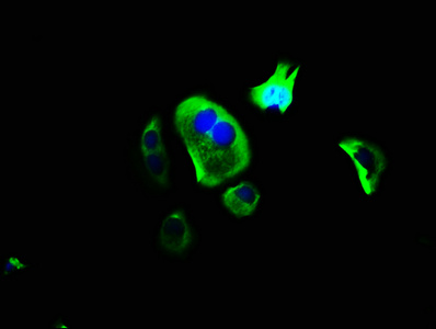 Immunofluorescence staining of MCF-7 cells with CSB-PA822719LA01HU at 1:166, counter-stained with DAPI. The cells were fixed in 4% formaldehyde, permeabilized using 0.2% Triton X-100 and blocked in 10% normal Goat Serum. The cells were then incubated with the antibody overnight at 4°C. The secondary antibody was Alexa Fluor 488-congugated AffiniPure Goat Anti-Rabbit IgG(H+L).
