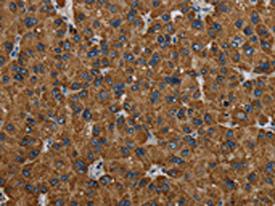 The image on the left is immunohistochemistry of paraffin-embedded Human liver cancer tissue using CSB-PA253485(PCK2 Antibody) at dilution 1/60, on the right is treated with fusion protein. (Original magnification: ×200)