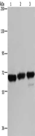 Gel: 6%SDS-PAGE, Lysate: 40 μg, Lane 1-3: 293T cells, Jurkat cells, Hela cells, Primary antibody: CSB-PA253485(PCK2 Antibody) at dilution 1/750, Secondary antibody: Goat anti rabbit IgG at 1/8000 dilution, Exposure time: 10 minutes