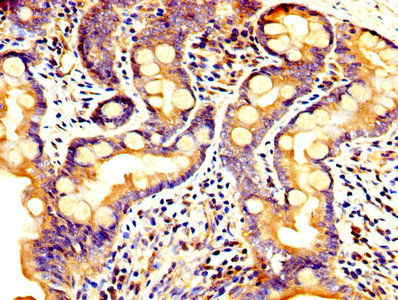 IHC image of CSB-PA017644LA01HU diluted at 1:300 and staining in paraffin-embedded human small intestine tissue performed on a Leica BondTM system. After dewaxing and hydration, antigen retrieval was mediated by high pressure in a citrate buffer (pH 6.0). Section was blocked with 10% normal goat serum 30min at RT. Then primary antibody (1% BSA) was incubated at 4°C overnight. The primary is detected by a biotinylated secondary antibody and visualized using an HRP conjugated SP system.