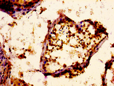 IHC image of CSB-PA017645LA01HU diluted at 1:400 and staining in paraffin-embedded human testis tissue performed on a Leica BondTM system. After dewaxing and hydration, antigen retrieval was mediated by high pressure in a citrate buffer (pH 6.0). Section was blocked with 10% normal goat serum 30min at RT. Then primary antibody (1% BSA) was incubated at 4°C overnight. The primary is detected by a biotinylated secondary antibody and visualized using an HRP conjugated ABC system.