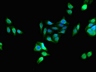 Immunofluorescent analysis of HepG2 cells using CSB-PA017651LA01HU at dilution of 1:100 and Alexa Fluor 488-congugated AffiniPure Goat Anti-Rabbit IgG(H+L)