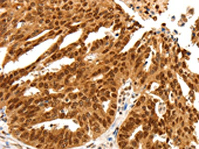 The image on the left is immunohistochemistry of paraffin-embedded Human ovarian cancer tissue using CSB-PA592469(PDCD6 Antibody) at dilution 1/25, on the right is treated with fusion protein. (Original magnification: ×200)