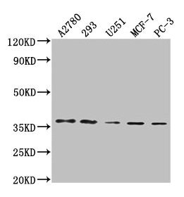 Positive WB detected in: A2780 whole cell lysate, 293 whole cell lysate, U251 whole cell lysate, MCF-7 whole cell lysate, PC-3 whole cell lysate