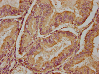 IHC image of CSB-PA617840LA01HU diluted at 1:100 and staining in paraffin-embedded human endometrial cancer performed on a Leica BondTM system. After dewaxing and hydration, antigen retrieval was mediated by high pressure in a citrate buffer (pH 6.0). Section was blocked with 10% normal goat serum 30min at RT. Then primary antibody (1% BSA) was incubated at 4°C overnight. The primary is detected by a biotinylated secondary antibody and visualized using an HRP conjugated SP system.