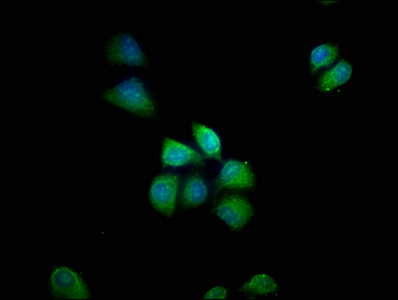 Immunofluorescence staining of Hela cells with CSB-PA529743LA01HU at 1:66, counter-stained with DAPI. The cells were fixed in 4% formaldehyde, permeabilized using 0.2% Triton X-100 and blocked in 10% normal Goat Serum. The cells were then incubated with the antibody overnight at 4°C. The secondary antibody was Alexa Fluor 488-congugated AffiniPure Goat Anti-Rabbit IgG(H+L).
