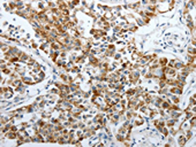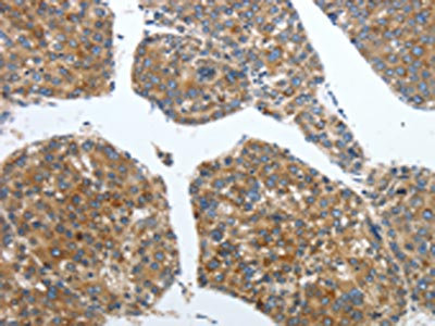 The image on the left is immunohistochemistry of paraffin-embedded Human liver cancer tissue using CSB-PA656448(PDK2 Antibody) at dilution 1/40, on the right is treated with synthetic peptide. (Original magnification: ×200)