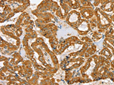 The image on the left is immunohistochemistry of paraffin-embedded Human thyroid cancer tissue using CSB-PA113942(PDP1 Antibody) at dilution 1/30, on the right is treated with fusion protein. (Original magnification: ×200)